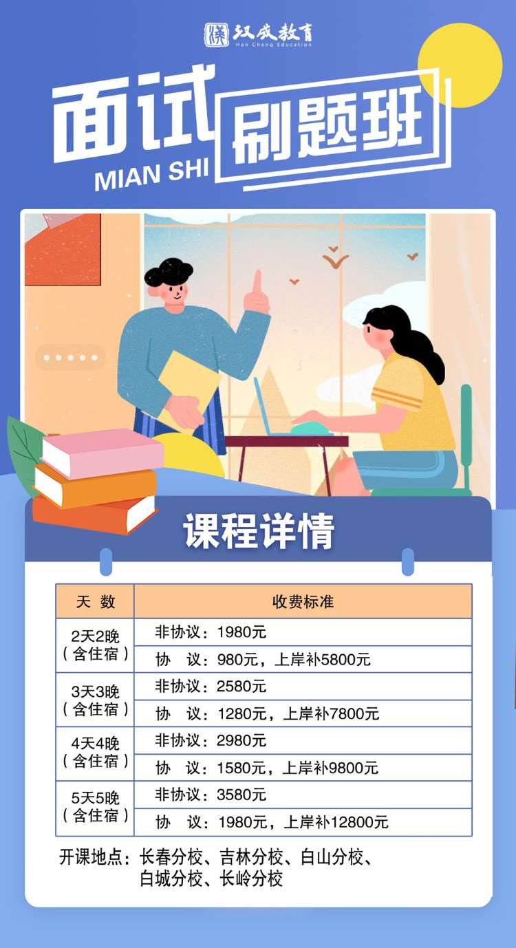面试刷题班:2天2晚(含住宿);3天3晚;4天4晚(含住宿);5天5晚(含住宿);开课地点:长春分校、吉林分校、白山分校、白城分校、长岭分校