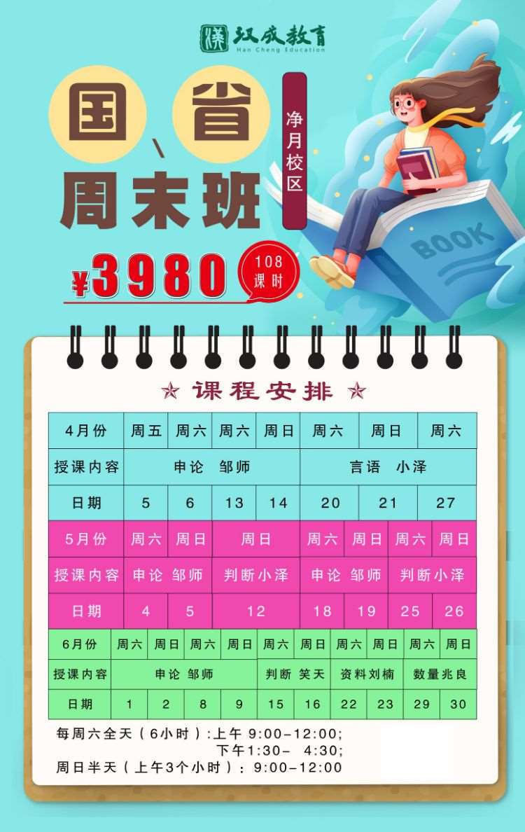 国考周末班,每周六全天(6小时),上午9:00-12:00;下午1:30-4:30;周日半天(上午3个小时):9:00-12:00.